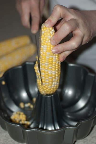 After you’ve husked your corn, stand one end of the corn cob on the middle of the bundt pan. The hole in the middle of the pan allows you to hold the corn cob securely so you can easily cut the corn kernels off the cob.