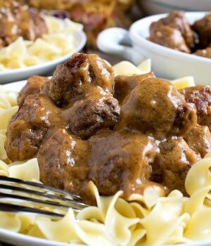 Swedish Meatballs over Noodles are tender savory meatballs smothered in gravy and served over noodles. Fantastic comfort food!