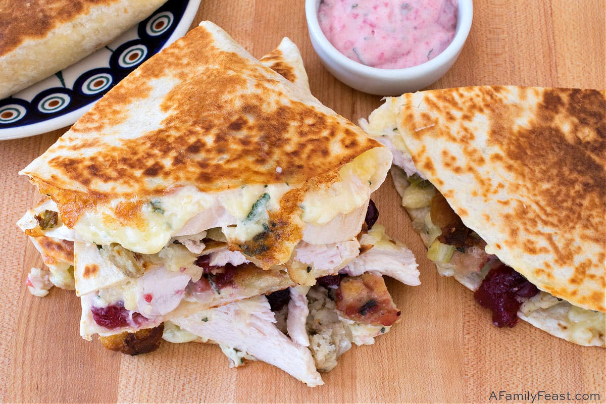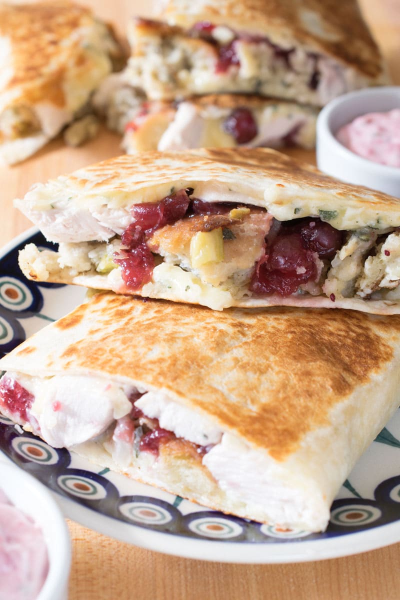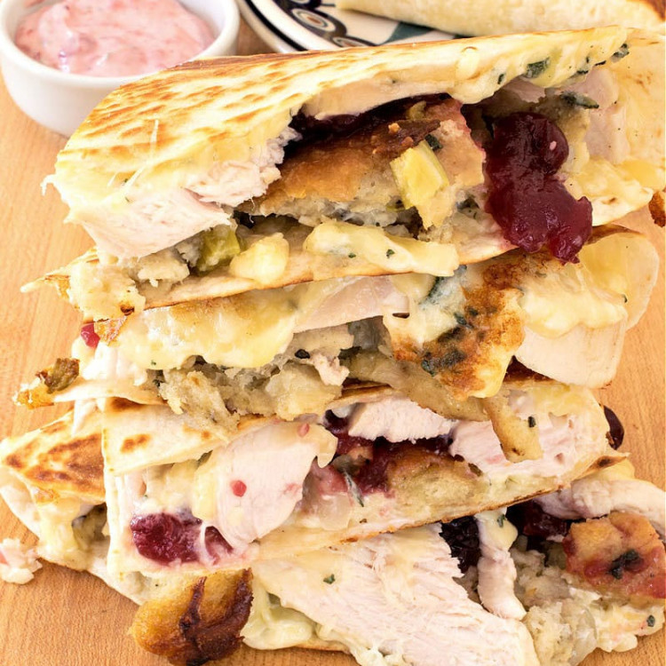 Thanksgiving Quesadillas are grilled flour tortillas piled high with slices of leftover turkey, stuffing and cranberry sauce plus fresh sage, mayonnaise and melted Monterey Jack cheese. Serve with a delicious creamy dipping sauce.
