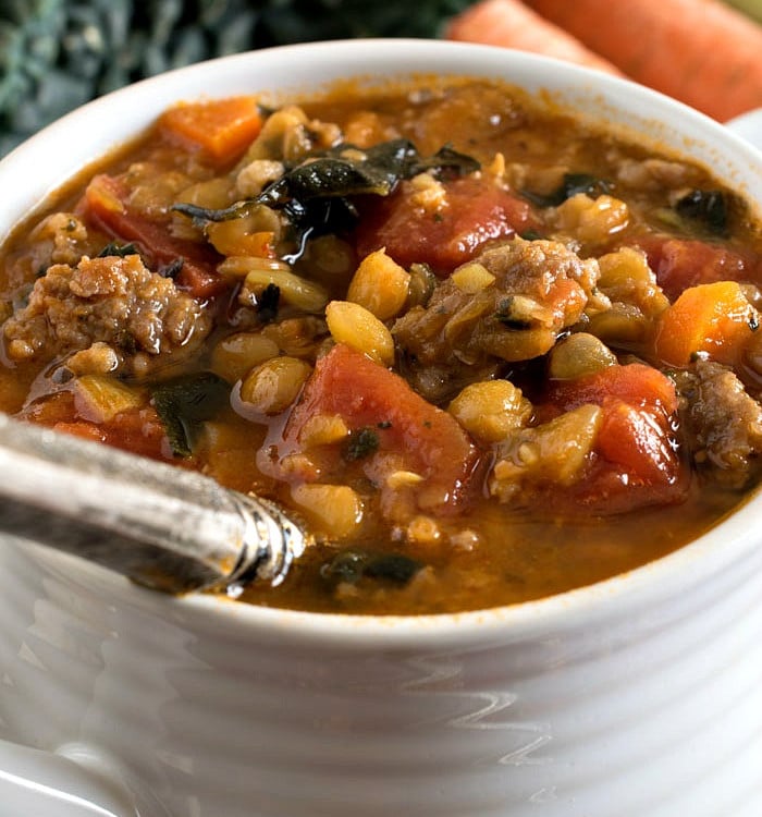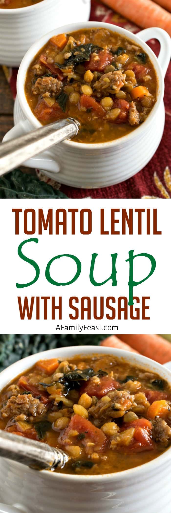 Tomato Lentil Soup with Sausage has zesty Italian sausage, earthy lentils, and diced tomatoes in a delicious broth.