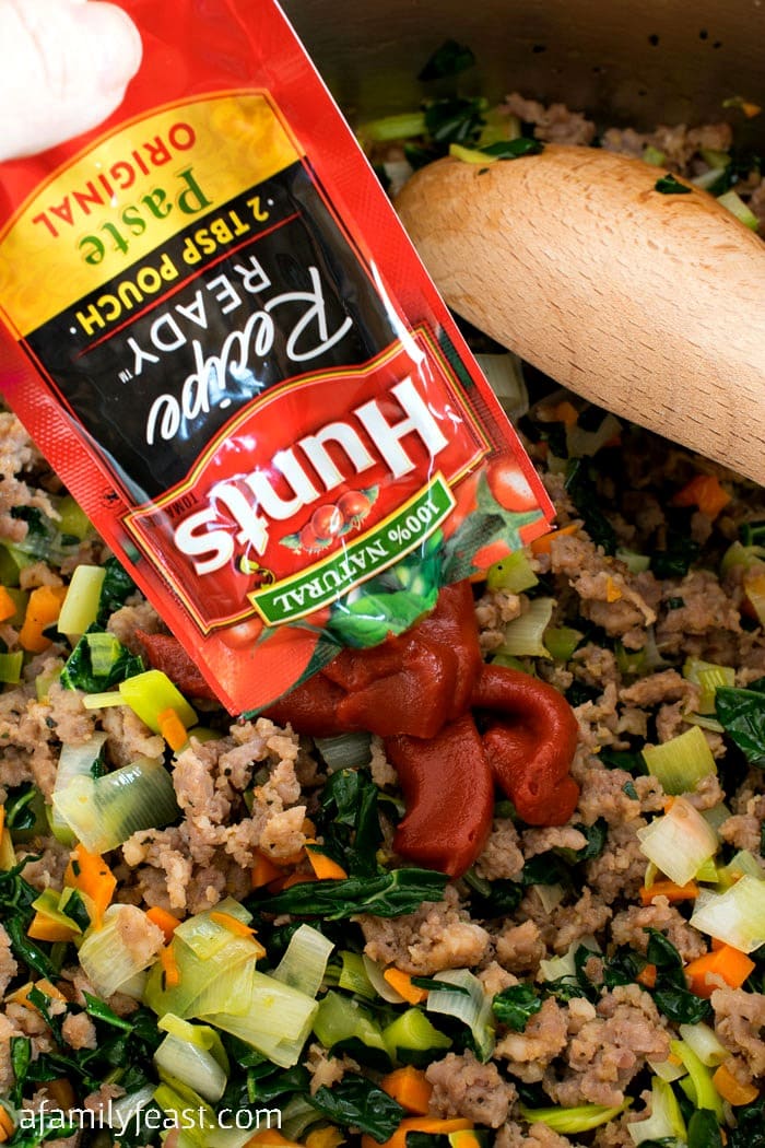 But the key to achieving a rich, deep broth for this Tomato Lentil Soup with Sausage is by adding Hunt’s Recipe Ready Tomato Paste!