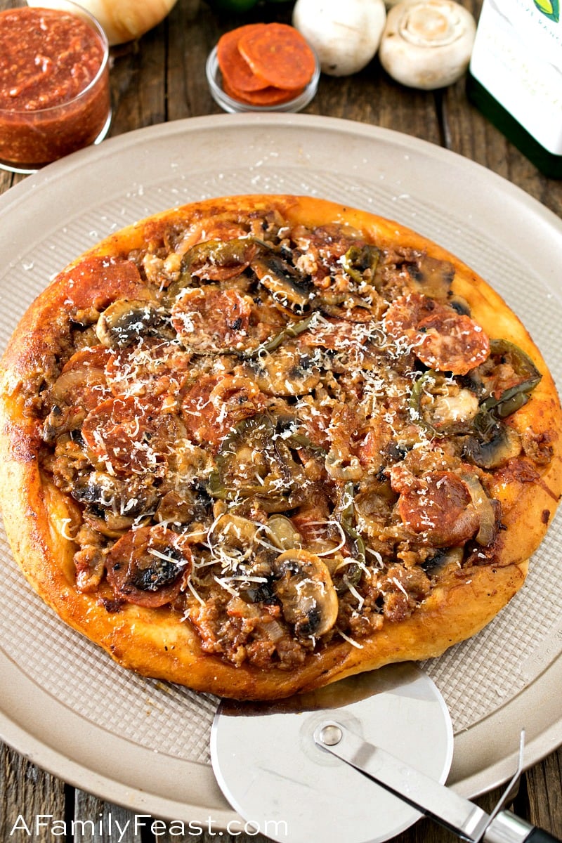 This recipe uses all of your typical homemade pizza ingredients – pizza dough (you can make your own using this recipe or use store-bought), pizza sauce (if you haven’t tried this homemade easy, no-cook pizza sauce recipe yet – you should), and your favorite toppings. We went with sweet Italian sausage, mushrooms, green bell peppers, onions, pepperoni, and three kinds of cheese (mozzarella, provolone, and Parmesan). What can I say – I like my pizzas loaded with lots of toppings.