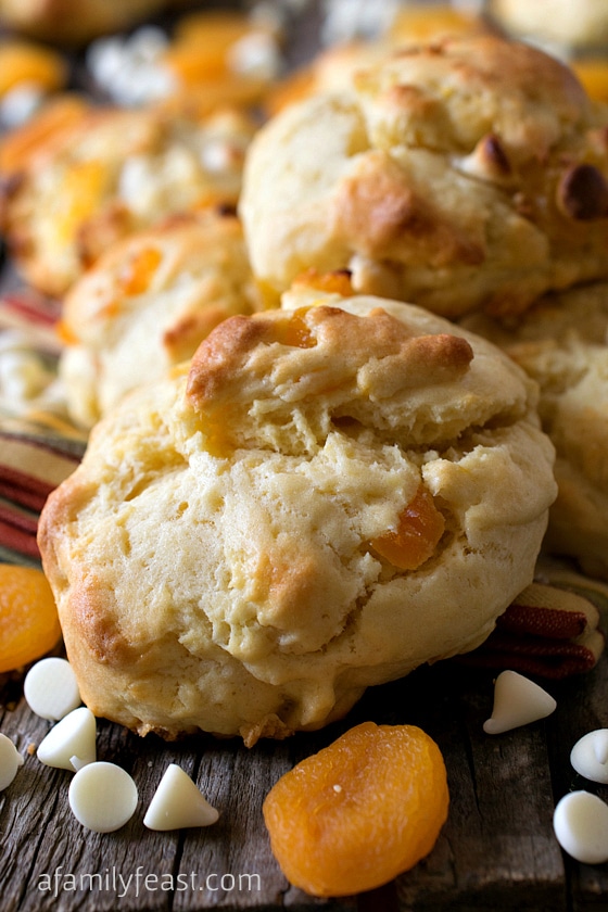 This recipe uses the same, super moist and delicious scone recipe that we used here and here, a versatile passed-down family recipe from my sister-in-law Pam! (See – I told you – recipe inspiration comes from many places!) I bumped up the sweetness just a bit in this version and added in a mix of chopped dried apricots and white chocolate chips.