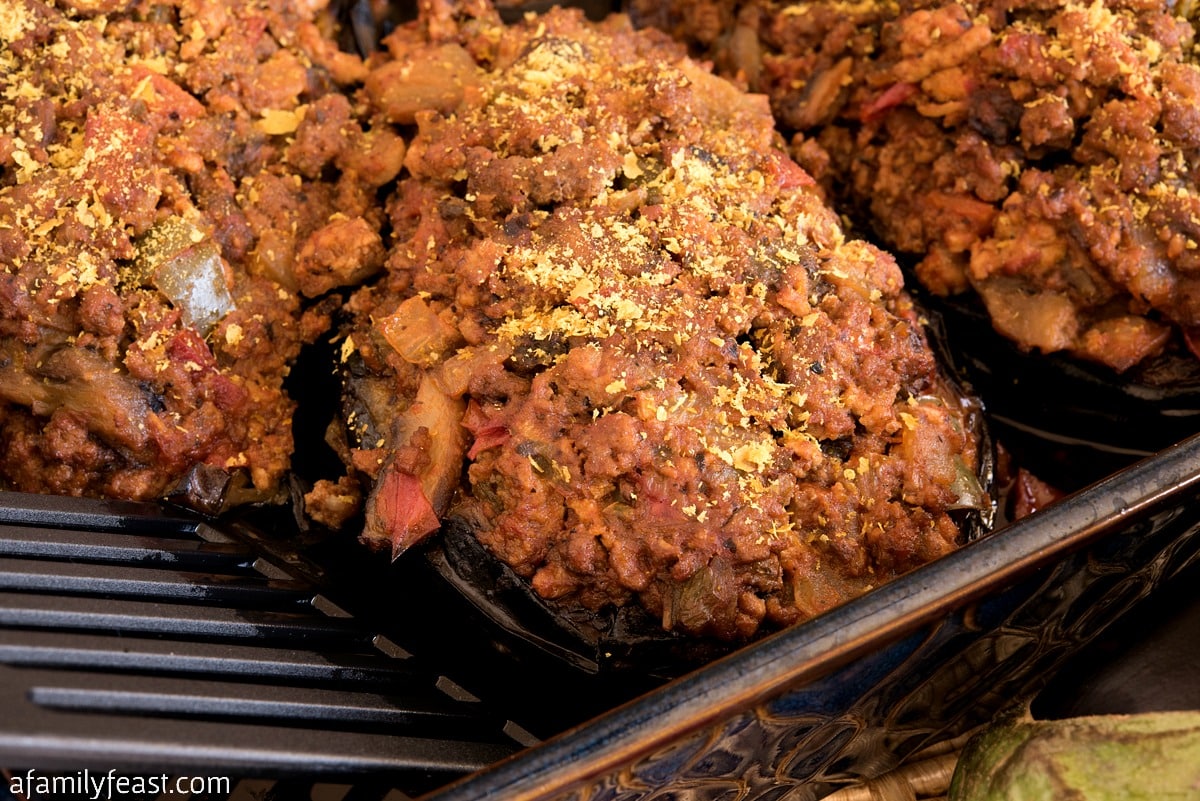 Then, the meat and vegetable stuffed eggplant is baked in the oven until fully cooked through and tender.