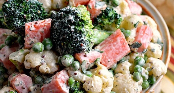 The broccoli, carrots and cauliflower are combined with peas (we used frozen) and fresh chopped parsley, then topped with a creamy and zesty dressing made with mayonnaise, sour cream, mustard (Dijon and whole grain) and a touch of sriracha. The dressing is also seasoned with dry tarragon and celery seed – both seasonings are a great complement to the vegetables in the dish.