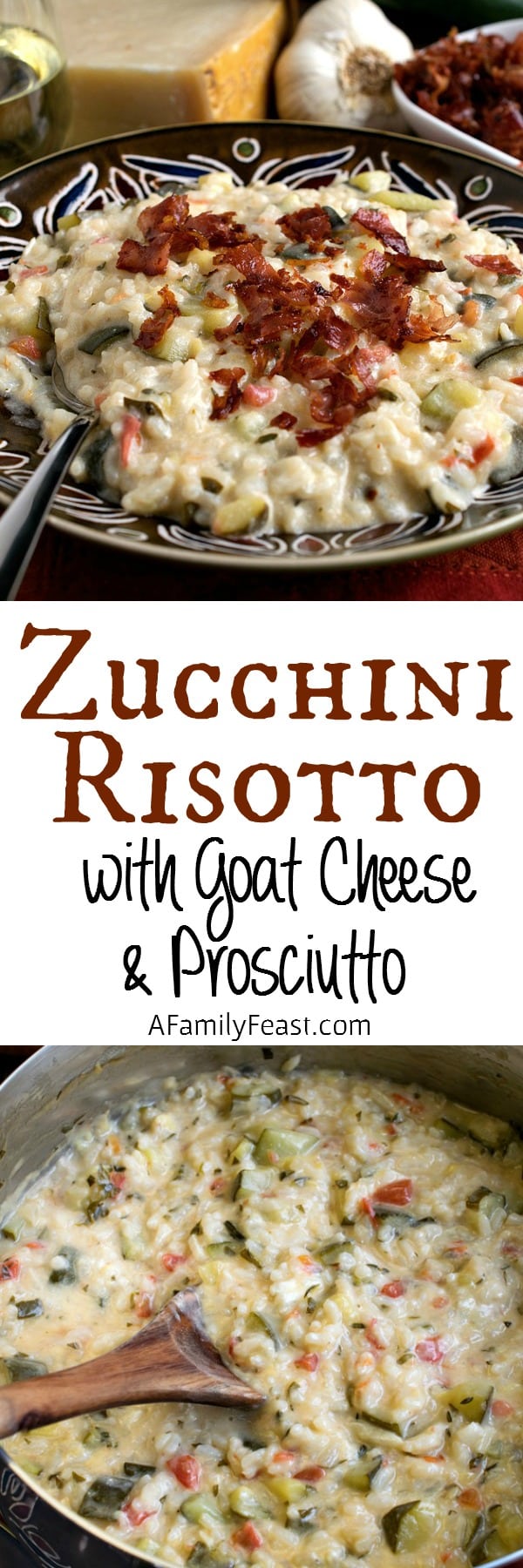 Zucchini Risotto with Goat Cheese and Prosciutto is creamy risotto with an extra kick of flavor from melted goat cheese stirred in at the end and crispy prosciutto on top.