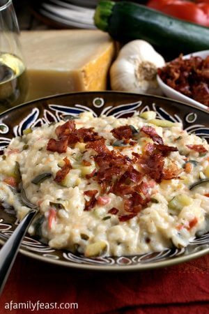 Fresh diced zucchini, onions, garlic and tomatoes are mixed with parmesan cheese and creamy Arborio rice that has been wonderfully seasoned with thyme, basil, parsley and mint – plus a bit of red pepper flakes for some gentle heat. But what really changes things up in this recipe is the addition of goat cheese which gets stirred into the cooked risotto at the end – adding a wonderful punch of flavor unlike any other risotto recipe we’ve made! Plus – some crispy prosciutto is sprinkled on top for a delightful salty garnish.